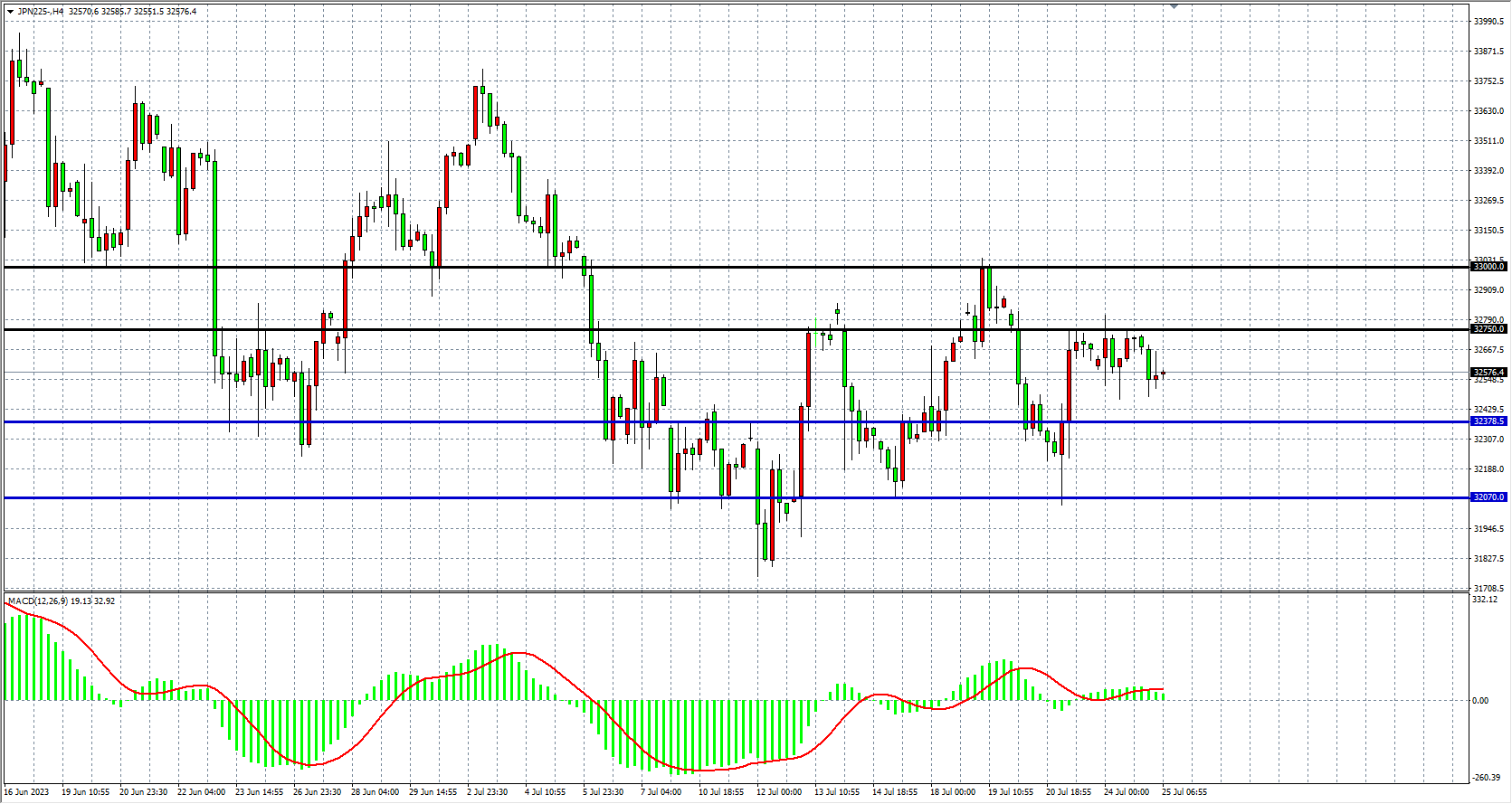 4小时图看,日经指数在反弹32750附近出现受阻,MACD量能在零轴之上维持缩量状态,行情仍宽幅震荡为主,阻力关注32750-33000,支撑关注32380-32070。