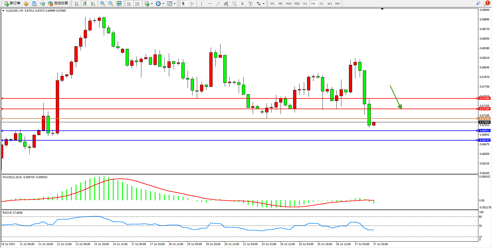 交易策略:0.67130下方看跌,目标0.66913  0.66743