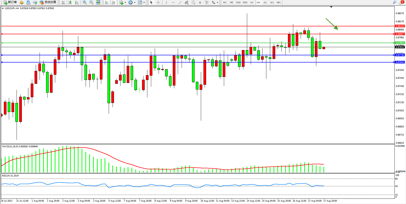 美元瑞郎USDCHF——4小时K线图显示: