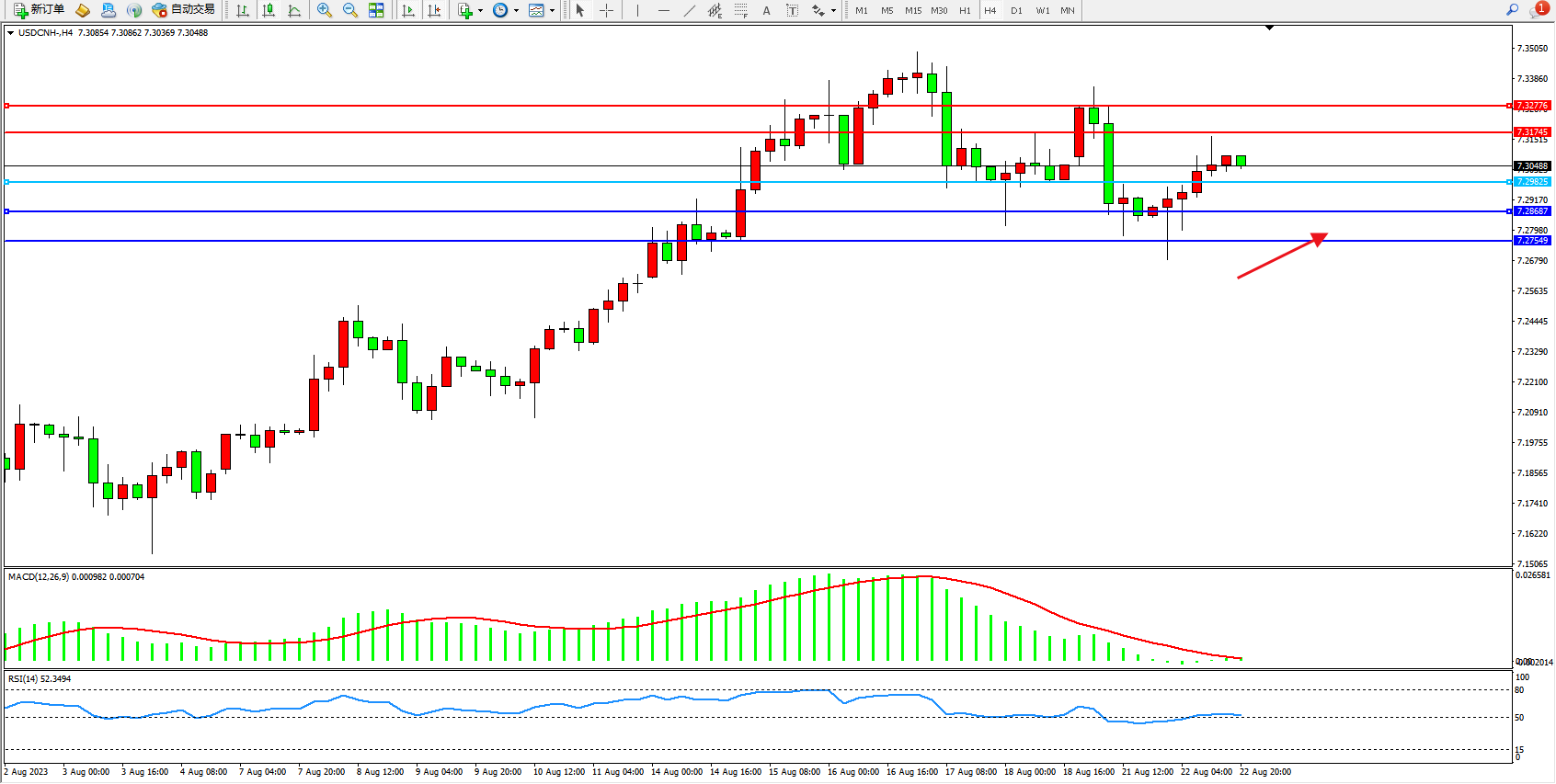 备选策略:7.29825下方看跌,目标7.28687 7.27549
