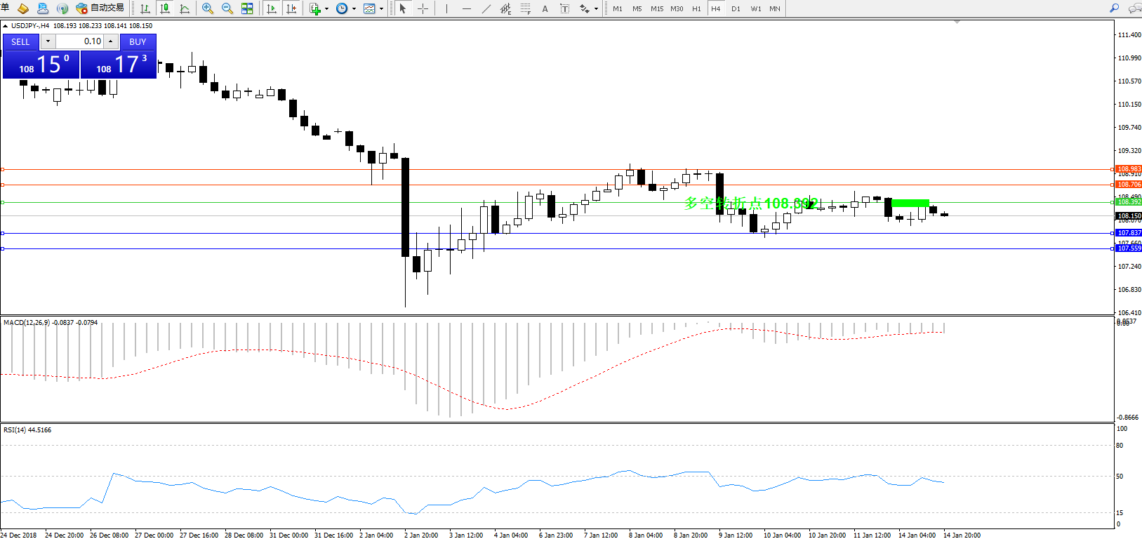 交易策略:108.392下方看跌,目标107.837、107.559