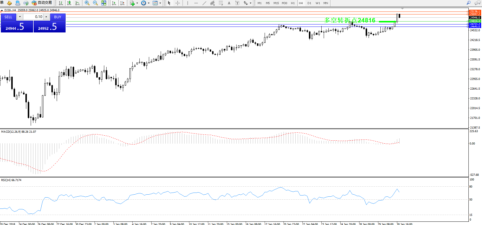 道琼斯指数DJ30—— 4小时K线图显示: