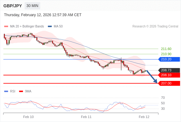 在 210.20 之下,看跌,目标价位为 208.10 ,然后为 207.00 。