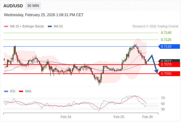 交易策略: 在 0.7110 之下,看跌,目标价位为 0.7070 ,然后为 0.7050 。