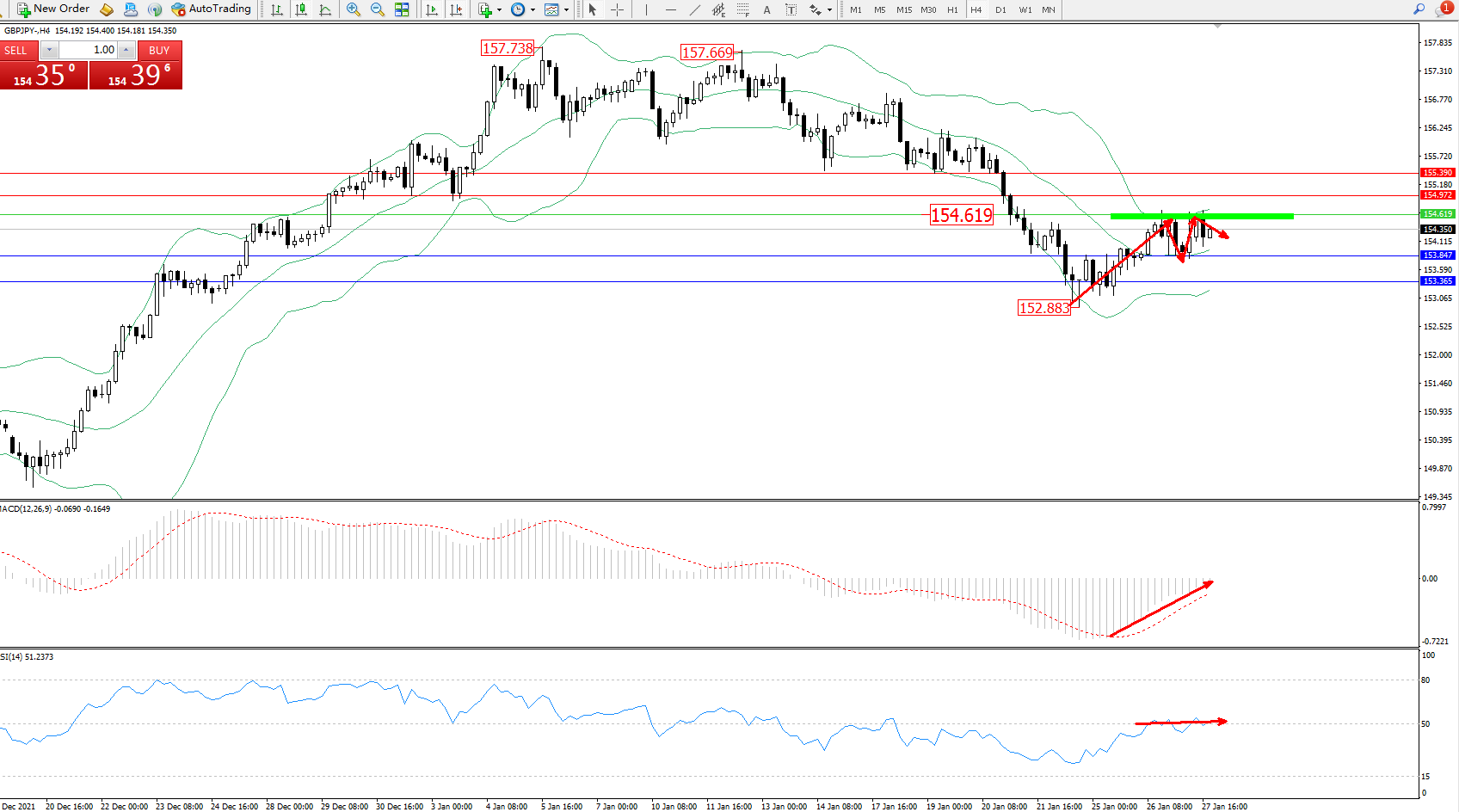 备选策略:154.619上方看涨,目标154.972、155.390