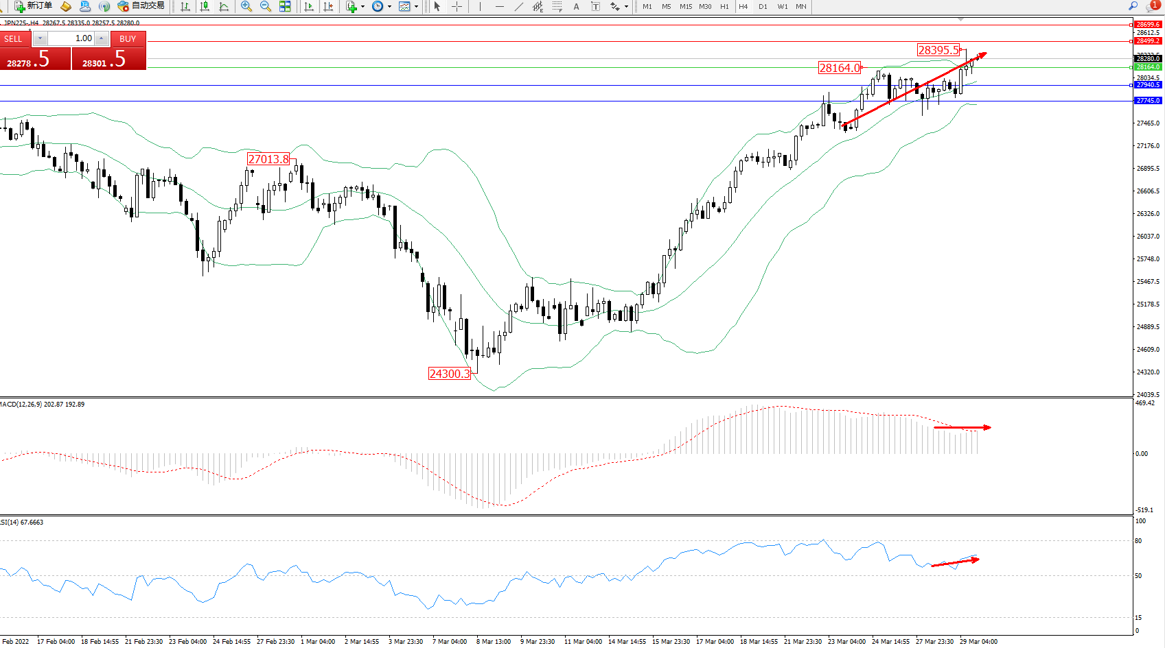 技术点评:多头动力延续布林带指标通道中上轨区间持续震荡上扬,高位抵达28395位置节点后开始徘徊,短期多头拉升态势良好,布林带指标呈上行去睡觉走势良好,MACD指标处于多头区域维持整理平移,RSI指标处于多头区域维持弱势徘徊后开始上移;