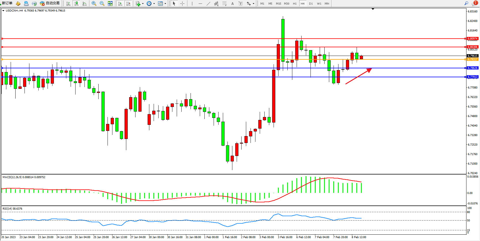 交易策略:6.79317上方看涨,目标6.80306、6.80974