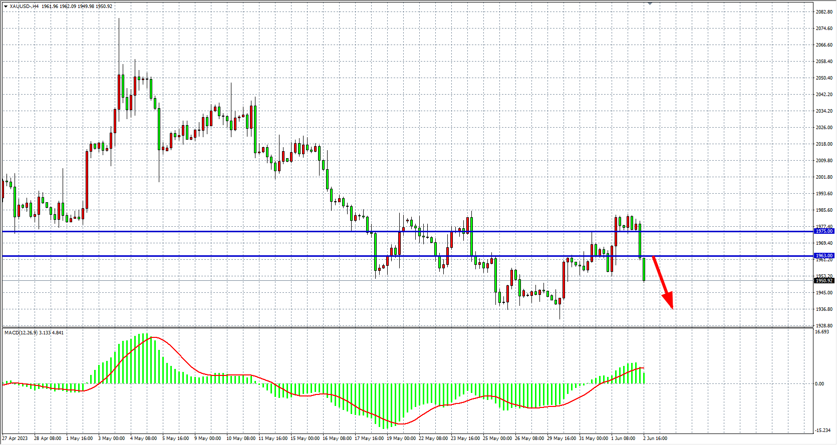 4小时图看,黄金在1983之下受阻回落,空头跌势加速,MACD量能在零轴之上开始缩量,当前阻力关注在1963,在该位之下继续看1935-1920附近。