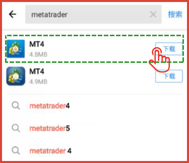 在安卓应用商店(例如:应用宝)中,搜索MetaTrader4,点击“下载”安装即可完成。如下图所示: